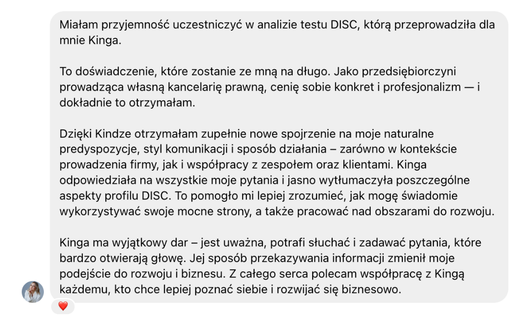 Zrób certyfikowany test DISC + weź udział w indywidualnej sesji omawiającej wyniki. Jako certyfikowany trener metody DISC pokażę Ci w co inwestować swój czas, aby przyniosło Ci to realne korzyści i zwiększenie sprzedaży. Jeżeli jesteś właścicielką salonu beauty, po wykonaniu badania dowiesz się, jakie masz naturalne predyspozycje pod kątem sprzedaży, pracy z zespołem i obsługi klienta. Poznasz swoje lepsze i słabsze strony, dzięki czemu będziesz wiedzieć nad czym pracować, aby być lepszą przedsiębiorczynią. Jest to świetne narzędzie również dla osób, które chcą poznać lepiej samego siebie i otoczenie.